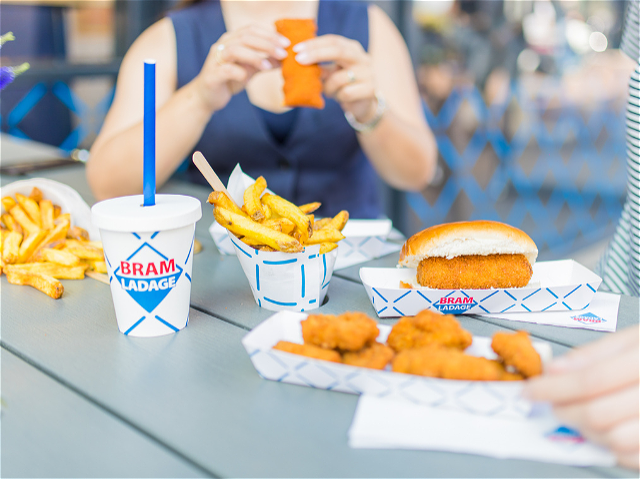 Lekkere malse licht gepaneerde gefrituurde kip met daarbij een verse Bram en een milkshake naar keuze.